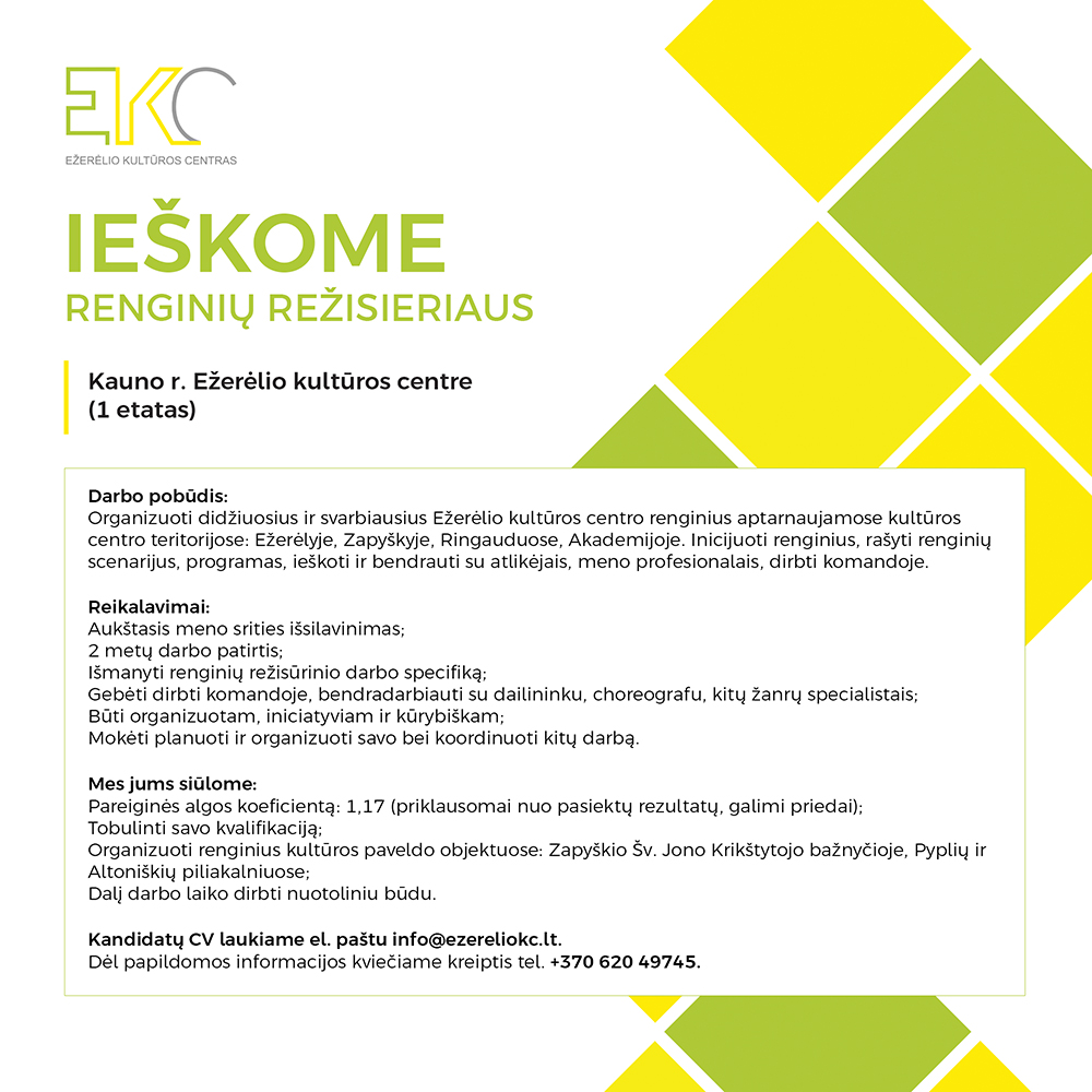 Dėl kandidatavimo ir papildomos informacijos kviečiame kreiptis el. paštu info@ezereliokc.lt arba tel. +370 620 49745.