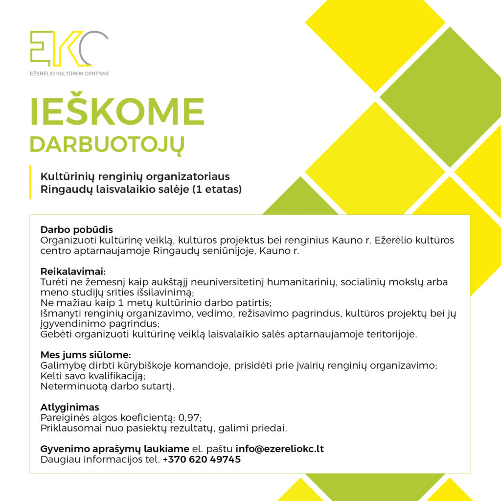 Kultūrinių renginių organizatoriaus Ringaudų laisvalaikio salėje (1 etatas)