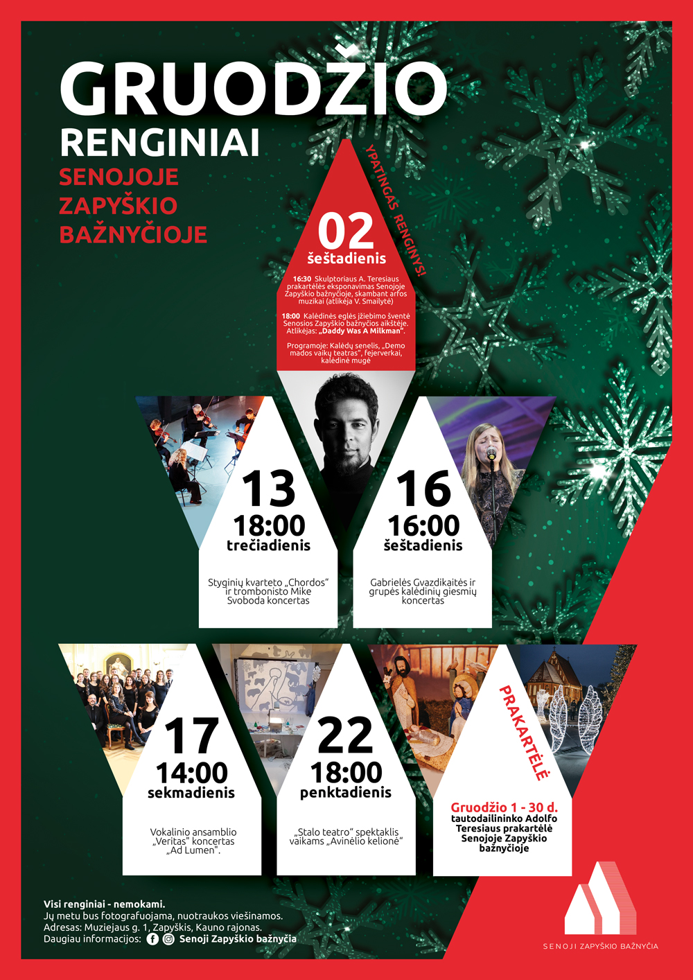 Gruodį Senojoje Zapyškio bažnyčioje Jūsų laukia ypatingi koncertai, šaunios edukacijos ir originali prakartėlė. Bažnyčia bus atvira lankytojams koncertų metu ir kiekvieną gruodžio penktadienį nuo 18.00 val. iki 20.00 val., o šeštadienį ir sekmadienį nuo 12.00 val. iki 20.00 val. Koncertai ir edukacijos bus nemokami.