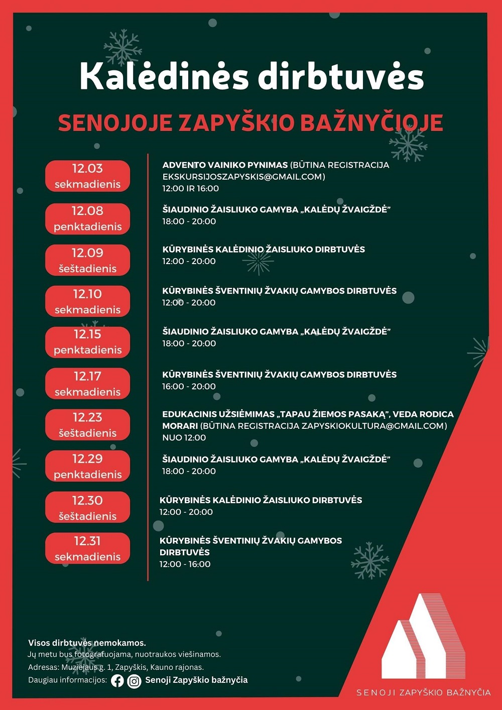 Gruodžio penktadieniai, šeštadieniais ir sekmadieniais bažnyčioje numatytos nemokamos edukacijos visai šeimai – šiaudinių žaisliukų, kalėdinių žaisliukų ir šventinių žvakių gamyba. Visa platesnė informacija – plakate (į dvejas edukacines dirbtuves reikalinga išankstinė registracija el. paštais). Atvykite ir šventiškai praleiskite laiką!