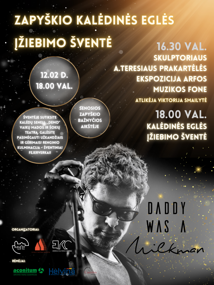 Kalėdinės eglutės įžiebimo šventė Senosios Zapyškio bažnyčios aikštėje. Atlikėjas: „Daddy Was A Milkman“. Taip pat jūsų lauks Kalėdų senelis, „Demo“ mados vaikų teatras, fejerverkai, unikalios teritorijos dekoracijos, renginio metu žiūrovai bus kviečiami pasmaguriauti įvairiais prekeivių teikiamais skanumynais bei susišildyti karštais gėrimais.