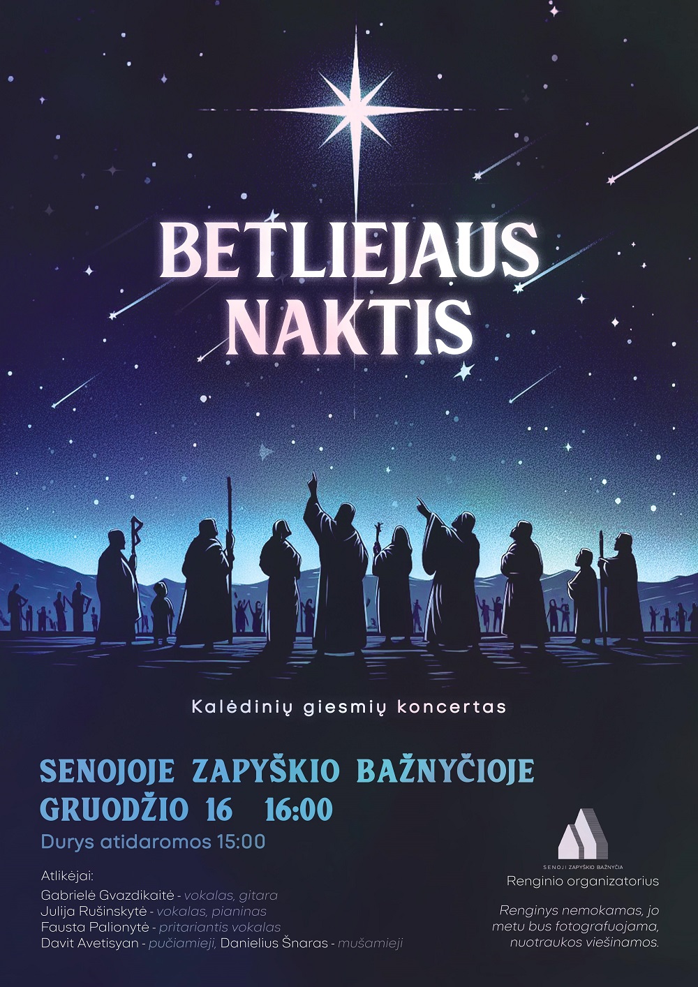 Gabrielės Gvazdikaitės ir grupės kalėdinių giesmių koncertas „Betliejaus naktis“ Senojoje Zapyškio bažnyčioje.