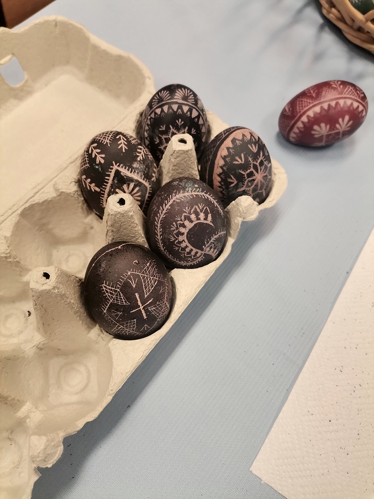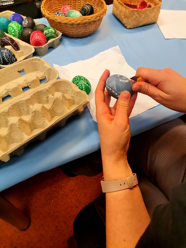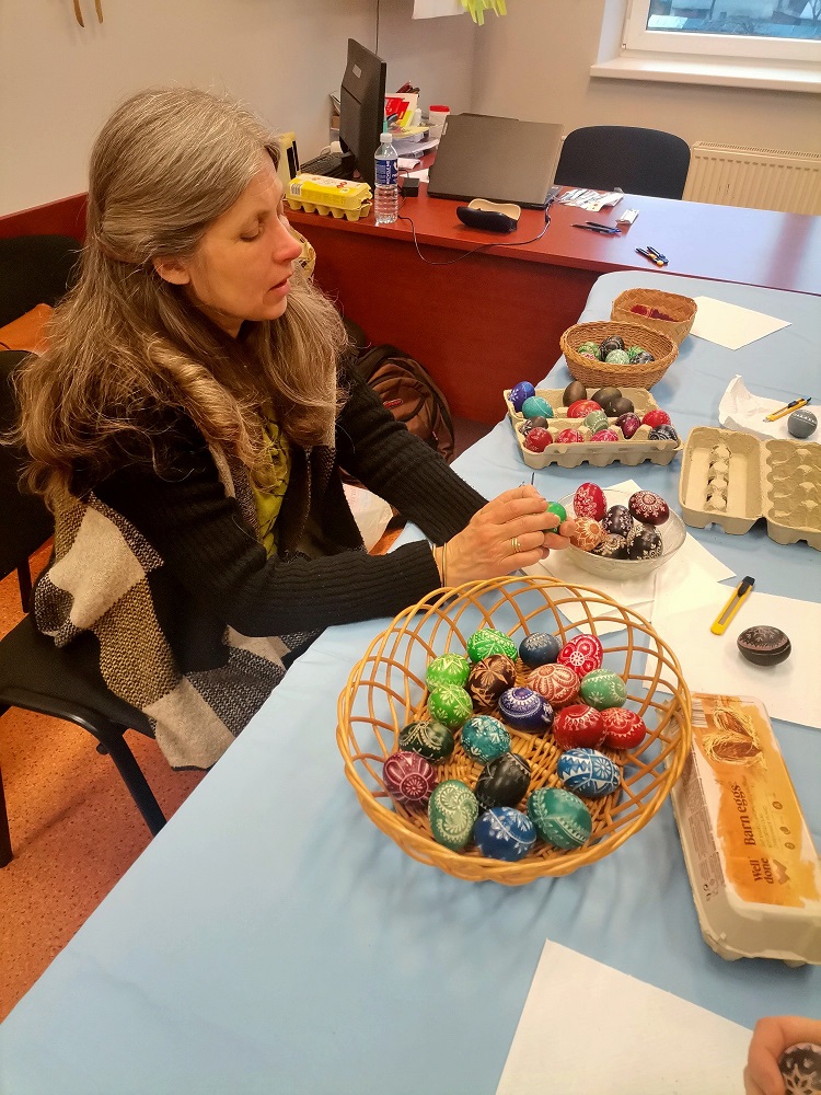 Balandžio 4 d. vakarą Ringaudų laisvalaikio salėje kartu su tautodailininke L. Liaudanskaite dalyviai mokėsi skutinėti kiaušinius.