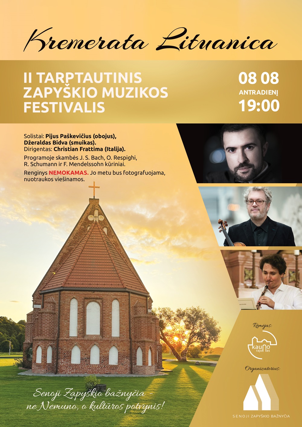 Rugpjūčio 8 d. (antradienį) 19 val. Zapyškis visus kvies pasinerti į klasikinės muzikos srovę drauge su „II-uoju tarptautiniu Zapyškio muzikos festivaliu“. Atidarymo koncerte – „Kremerata Lituanica“. Solistai: Pijus Paškevičius (obojus), Džeraldas Bidva (smuikas). Dirigentas ir festivalio meno vadovas – Christian Frattima (Italija).