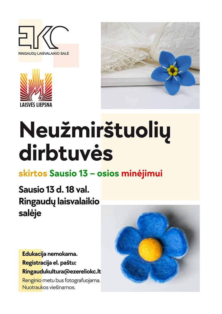 Kviečiame į jaukias ir prasmingas kūrybines dirbtuves, kurių metu galėsite patys pasigaminti Neužmirštuolės žiedą, naudodami kelias skirtingas technikas. Sukurtą simbolį galėsite įsisegti į švarką ar suknelę, arba pakabinti jums svarbioje vietoje.