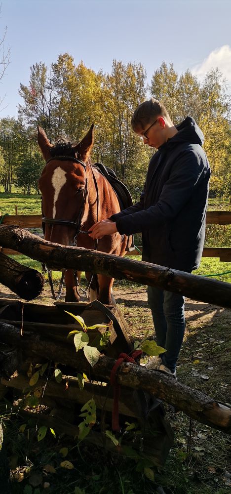 Mokiniai padedami instruktorių patys pabalnojo arklius ir drąsiausi galėjo jais pajodinėti.