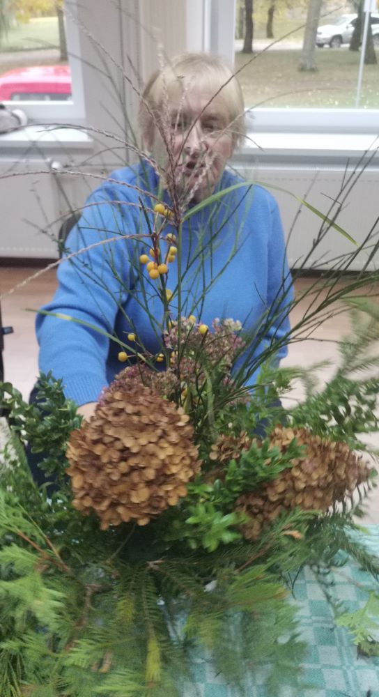 Išsiaiškinę, kaip pasiruošti augalus kompozicijai, kokias priemones naudoti, kibome į darbą. Tujų, eglių, pušų šakeles komponavome kartu su kankorėžiais, samanomis, pasigamintomis rožėmis ar vabalėliais ir gavome nuostabų rezultatą.