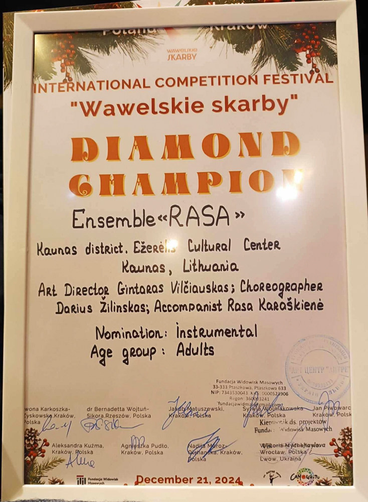 Kauno r. Ežerėlio kultūros centro tautinių šokių ansamblis „Rasa“ kalėdinių švenčių proga sulaukė pripažinimo tarptautiniame festivalyje – konkurse „Vavelio lobiai“ („Wawelskie skarby“).