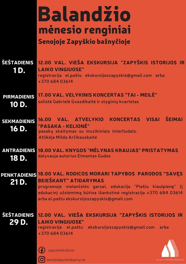 Svarbi žinia – balandį bažnyčia bus atvira lankytojams savaitgaliais (šeštadienį-sekmadienį) nuo 11 iki 18.30 val., o norintiems bažnyčią aplankyti ir darbo dienomis – prašome susisiekti telefonais +370 684 03614, +370 608 34591 arba parašyti ekskursijoszapyskis@gmail.com.