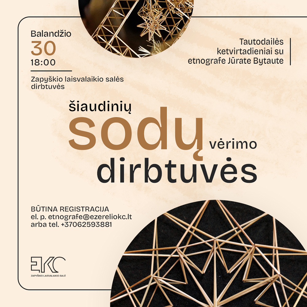 Kviečiame į jaukias šiaudinių sodų vėrimo dirbtuves – laiką, skirtą kūrybai, susikaupimui ir tradicijos pajautimui. Šį kartą kursime šiek tiek kitokius – kubilinius sodus. Vietų skaičius ribotas, tad būtinai registruokitės el. paštu zapyskis.etno@gmail.com arba tel. +370 625 93881.