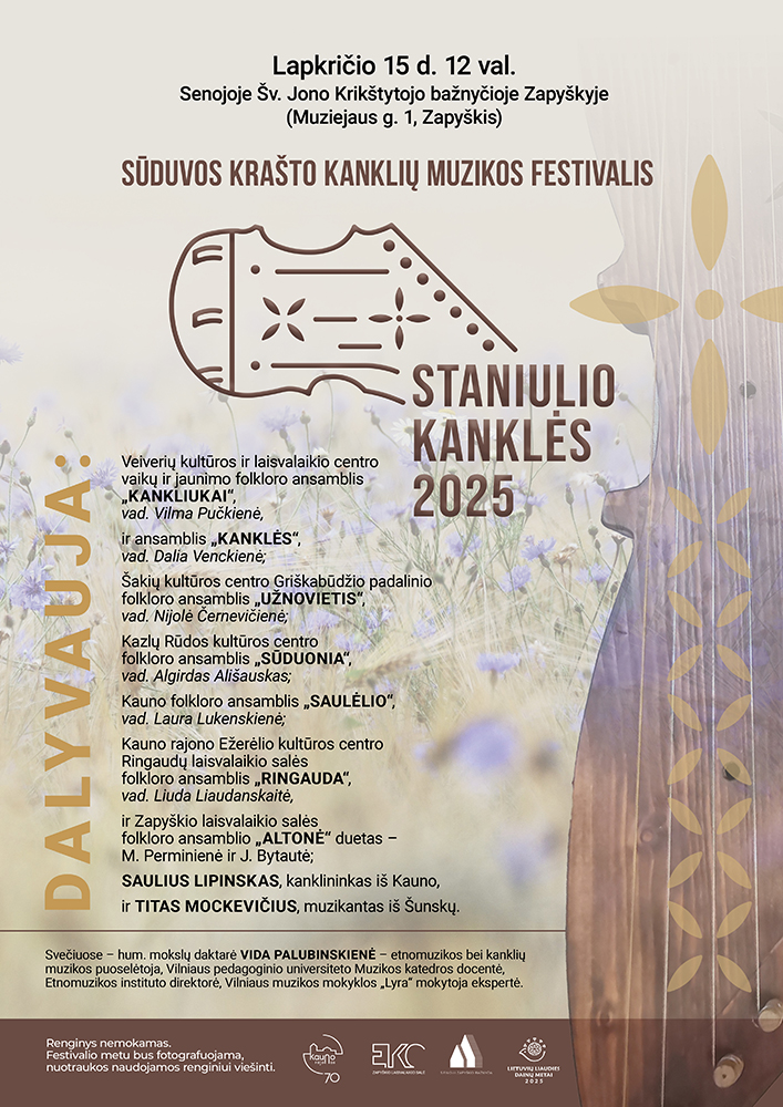 Lapkričio 15 d. 12 val. kviečiame gyvai susipažinti su Sūduvos krašto kankliavimo tradicija, kanklininkų brolių Staniulių istorija Sūduvos krašto kanklių muzikos festivalyje „Staniulio kanklės 2025“, kuris vyks senojoje Šv. Jono Krikštytojo bažnyčioje Zapyškyje (Muziejaus g. 1, Zapyškis).