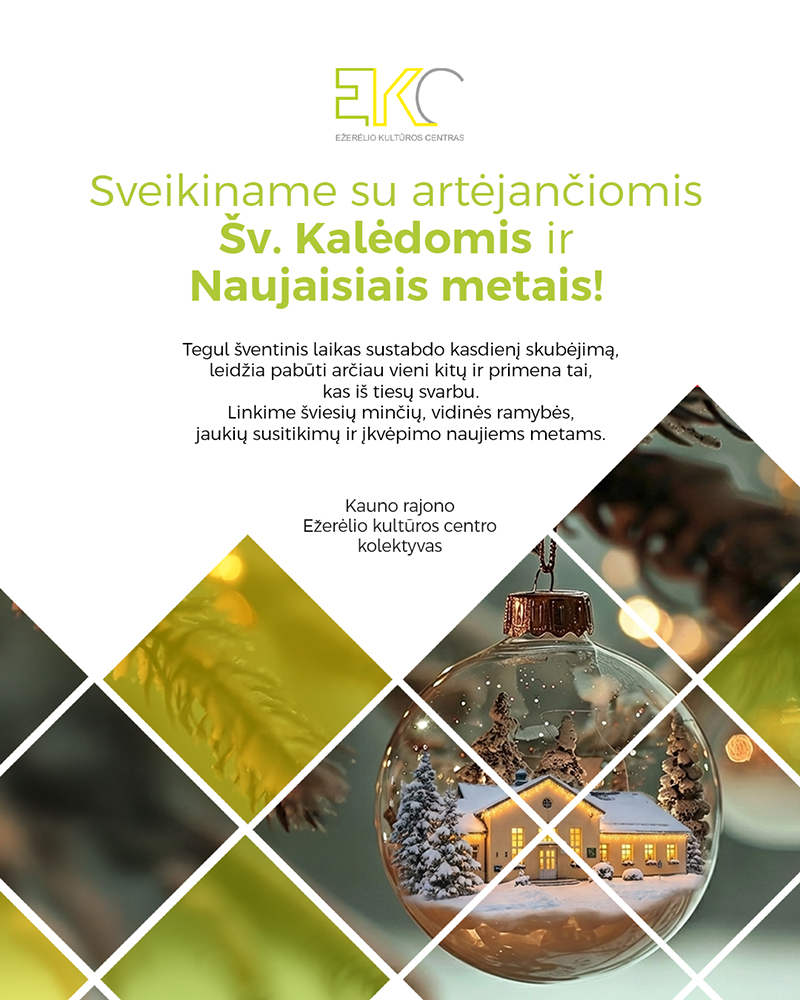 Kauno rajono Ežerėlio kultūros centro kolektyvas sveikina visus kultūrinių renginių lankytojus, partnerius, rėmėjus, žiūrovus, stebėtojus ir visus neabejingus mūsų organizuojamai kultūrinei veiklai su artėjančiomis Šv. Kalėdomis ir Naujaisiais metais!