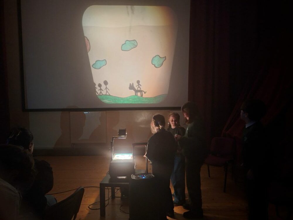 Ekrane atgijo vaikų nupiešti pasakų „Lapė ir varna“, „Džiuha ir trys išminčiai“, „Auksinis žirgas“ veikėjai.
