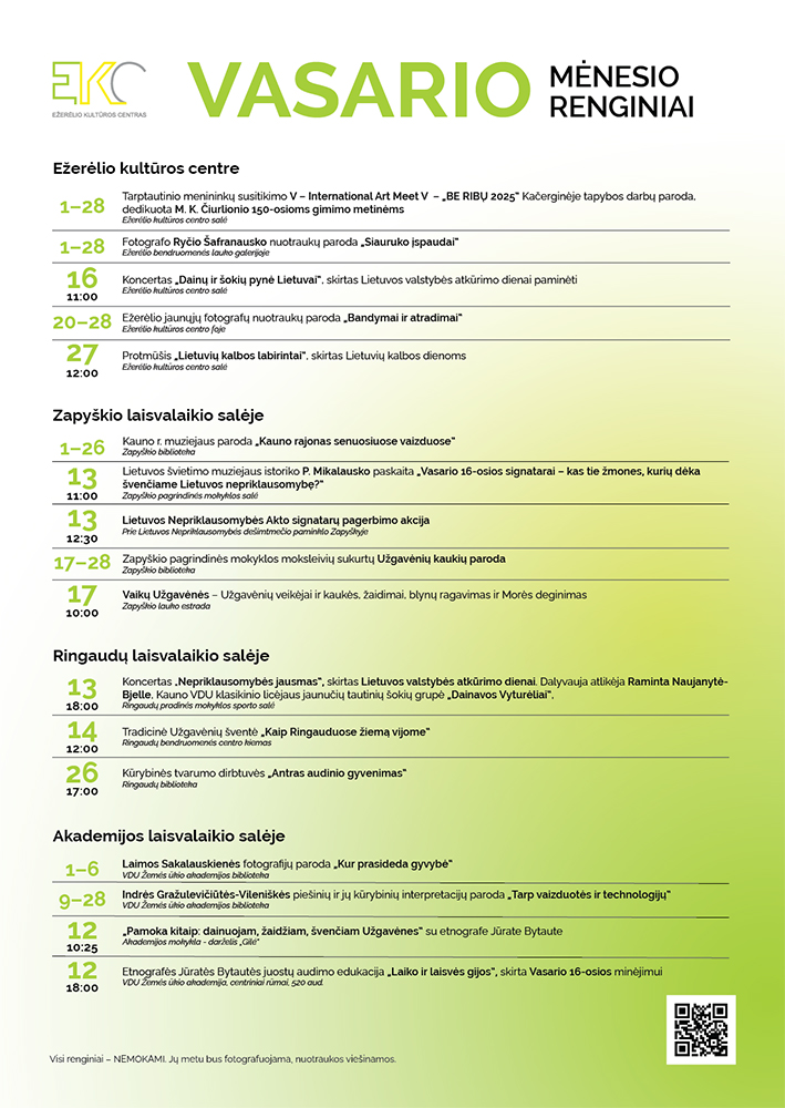 Kviečiame dalyvauti vasario mėnesio renginiuose – Jūsų laukia renginiai, skirti Lietuvos valstybės atkūrimo dienai: koncertai „Dainų ir šokių pynė Lietuvai“ Ežerėlyje ir „Nepriklausomybės jausmas“ Ringauduose, paskaita „Vasario 16-osios signatarai – kas tie žmones, kurių dėka švenčiame Lietuvos nepriklausomybę?“ Zapyškyje, juostų audimo edukacija „Laiko ir laisvės gijos“ Akademijoje.